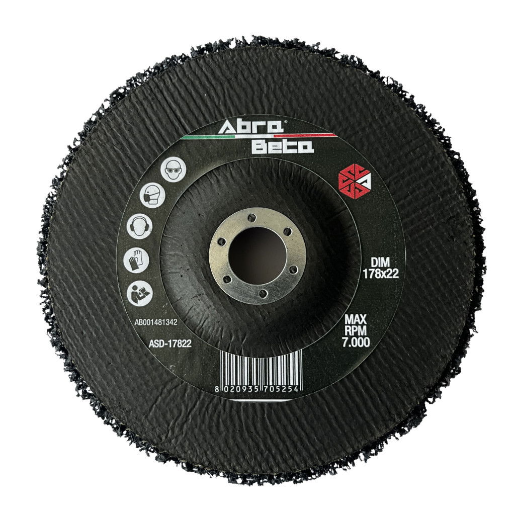 Az AbraBeta Stripping disc, más néven néger tárcsa, ideális felülettisztításhoz, festék, rozsda és egyéb bevonatok eltávolításához. Nagy tartóssága és hatékony csiszoló képessége miatt kiváló választás ipari és háztartási felhasználásra egyaránt. Javasolt felhasználás: Kézi sarokcsiszolóhoz. Átmérő: 178mm
