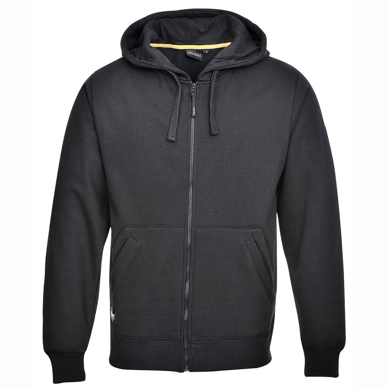 A munkaruházat stílusos kiegészítője lehet ez a teljesen zippzáros, könnyen kezelhető kapucnis pulóver.