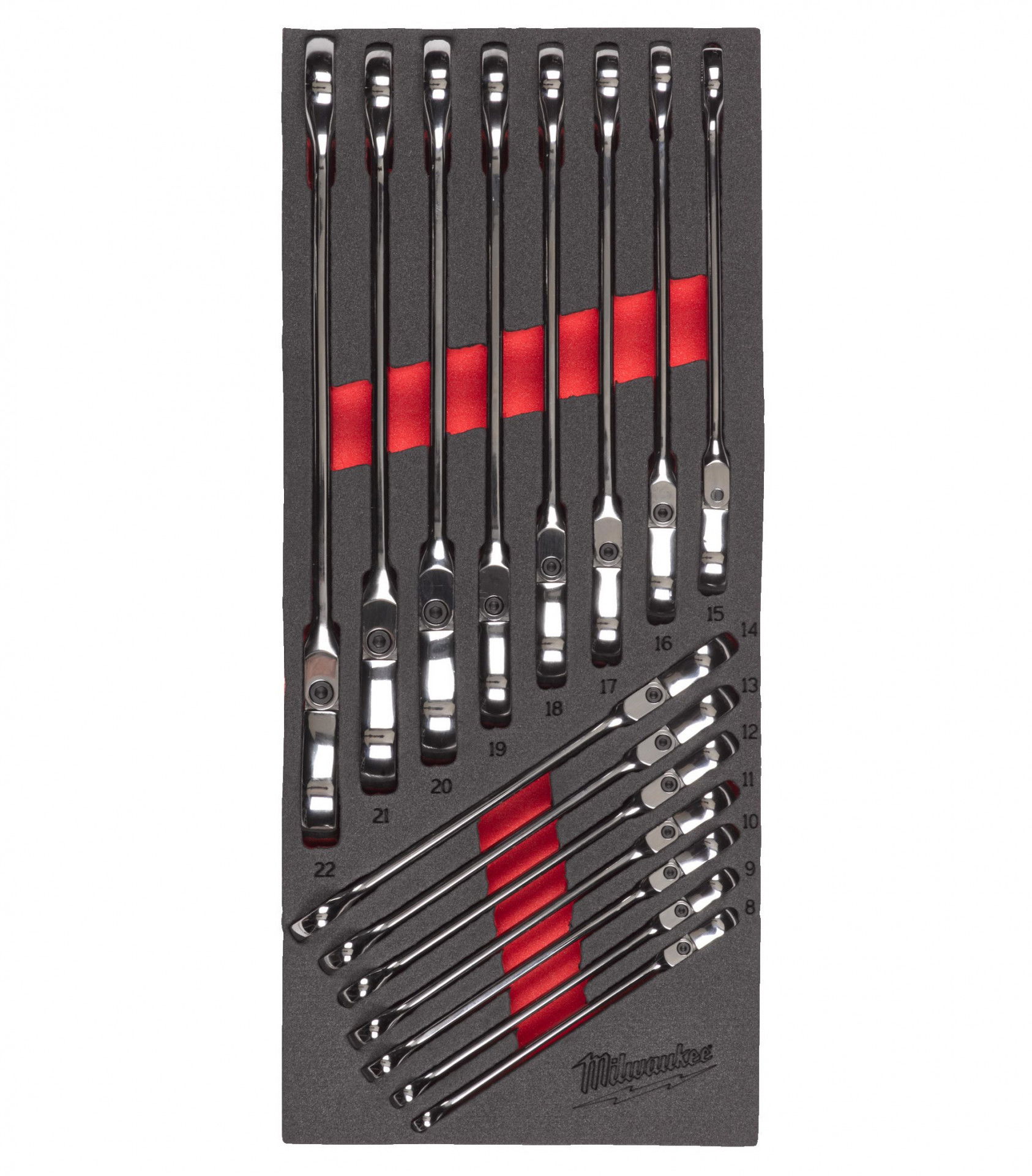 Milwaukee MAX BITE™ csuklós fejű racsnis csillag-villáskulcs készlet habbetétben, metrikus, 15 darabos