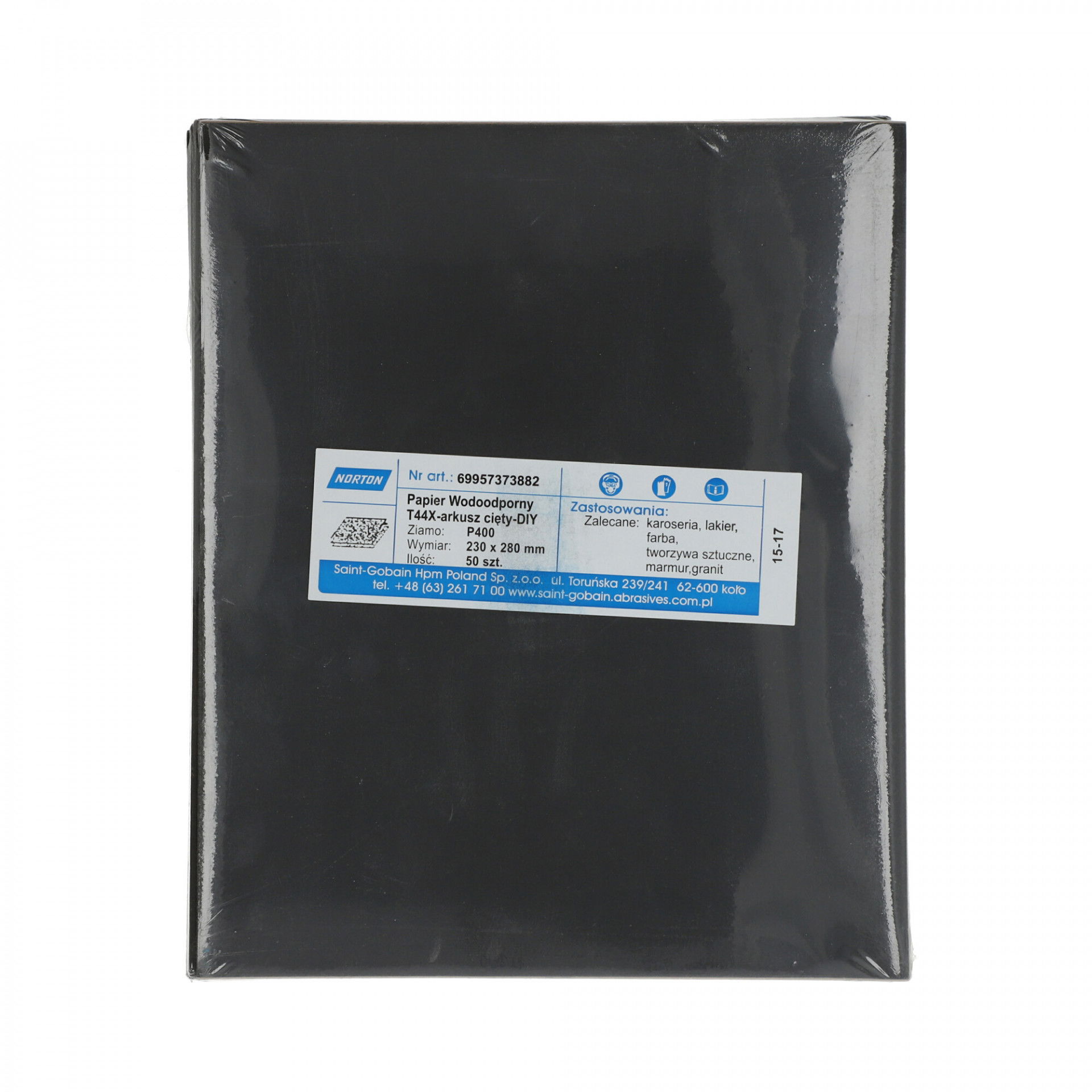 A Norton T44X vízálló csiszolópapír nagy teljesítményű szilíciumkarbid szemcsével nedves vagy száraz használatra alkalmas, nedves használat esetén tisztább felületet biztosít csiszolás közben. Gyors anyageltávolítás és simább és fényesebb felület elérése, ideális lakkozott felületeken való használatra és fémekhez. Festék- és lakkburkolatok, műanyagok, vas- és színesfémek csiszolására, polírozására is szolgál. Használható önmagában, csiszolótömbbel, kapcsos rögzítésű elektromos vagy akkumulátoros csiszológéppel.