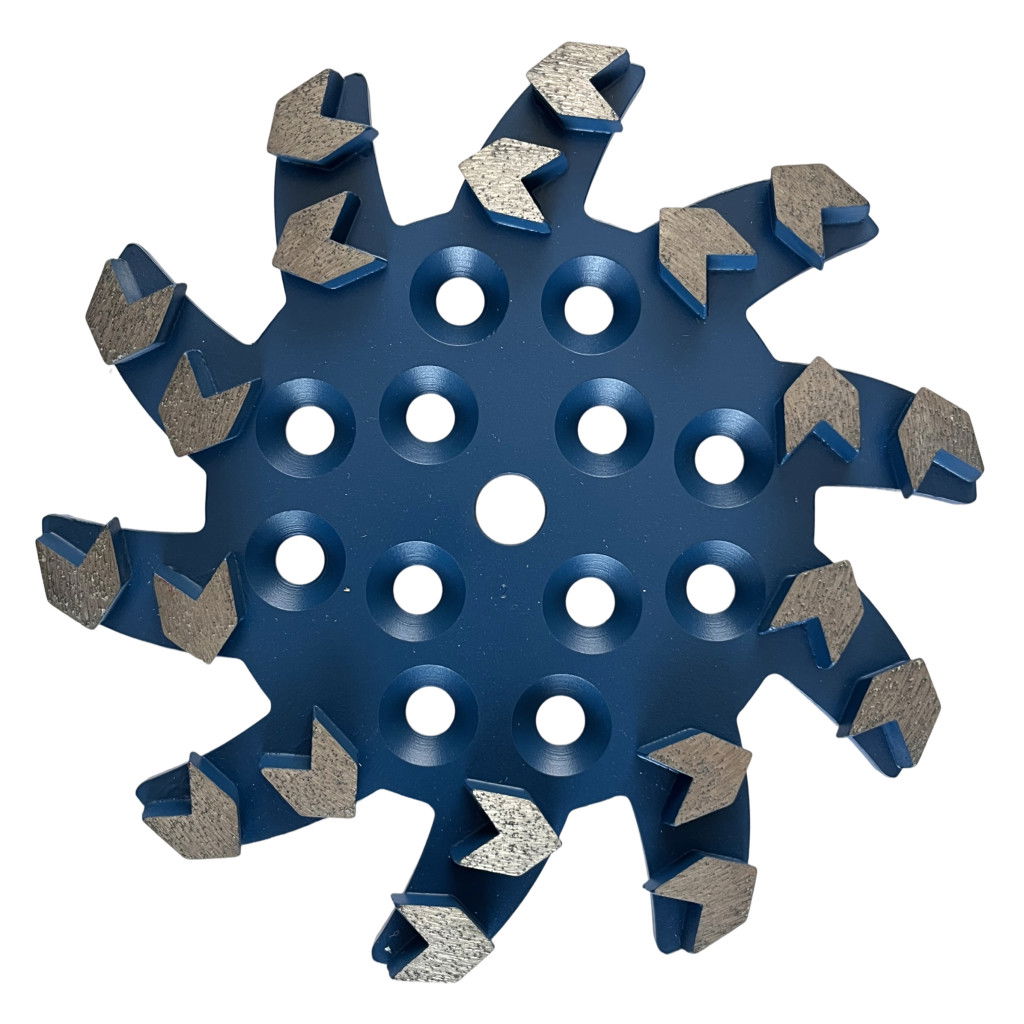 Prémium minőségű, 250 mm-es gyémánt csiszoló tárcsa padlócsiszoló gépekhez. 20 db, 12 mm magas V-alakú szegmense gyors és agresszív csiszolást biztosít friss betonon, miközben extra hosszú élettartamot garantál. Univerzális felfogatással minden elterjedt padlócsiszoló gépen használható.